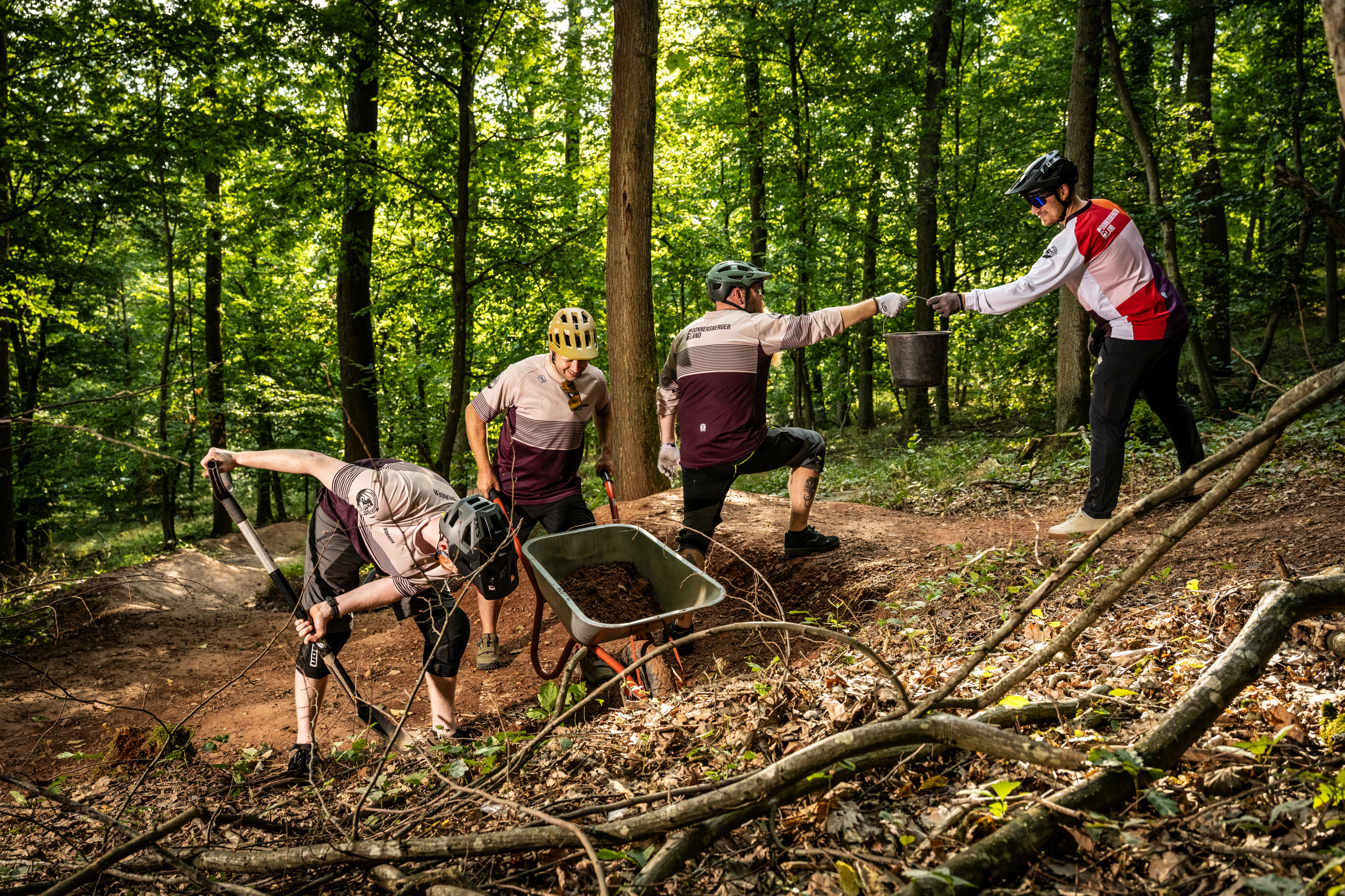 Für jeden der insgesamt acht Trails im Wald sind umfangreiche Vorgespräche zu führen, da viele Parteien einbezogen werden müssen. Die Bandbreite reicht von Förstern über Jagdpächter, private, kommunale oder staatliche Waldbesitzer bis hin zu Naturschutzbehörden. „Uns war es von Anfang an wichtig, ein legales Angebot zu schaffen. Deshalb wollen wir jeden mit ins Boot holen“, betont Christopher Dech. Ganz entscheidend sei dabei die Bereitschaft zum Kompromiss, denn man wolle ja „den Wald nicht kaputtmachen, sondern ein Naturerlebnis ermöglichen“. Beim Bau der Trails wird deshalb fast ausschließlich Material verwendet, das bereits im Wald ist. Alte Baumstämme, Steine oder Wurzeln dienen als Hindernisse. Was mit Erde modelliert wird, erhält eine Begrünung mit Gräsern und Moos. „Wir sind also nicht mit dem Bagger unterwegs oder graben tiefe Löcher“, erklärt er weiter, warum sich die Trails ins Landschaftsbild einpassen.