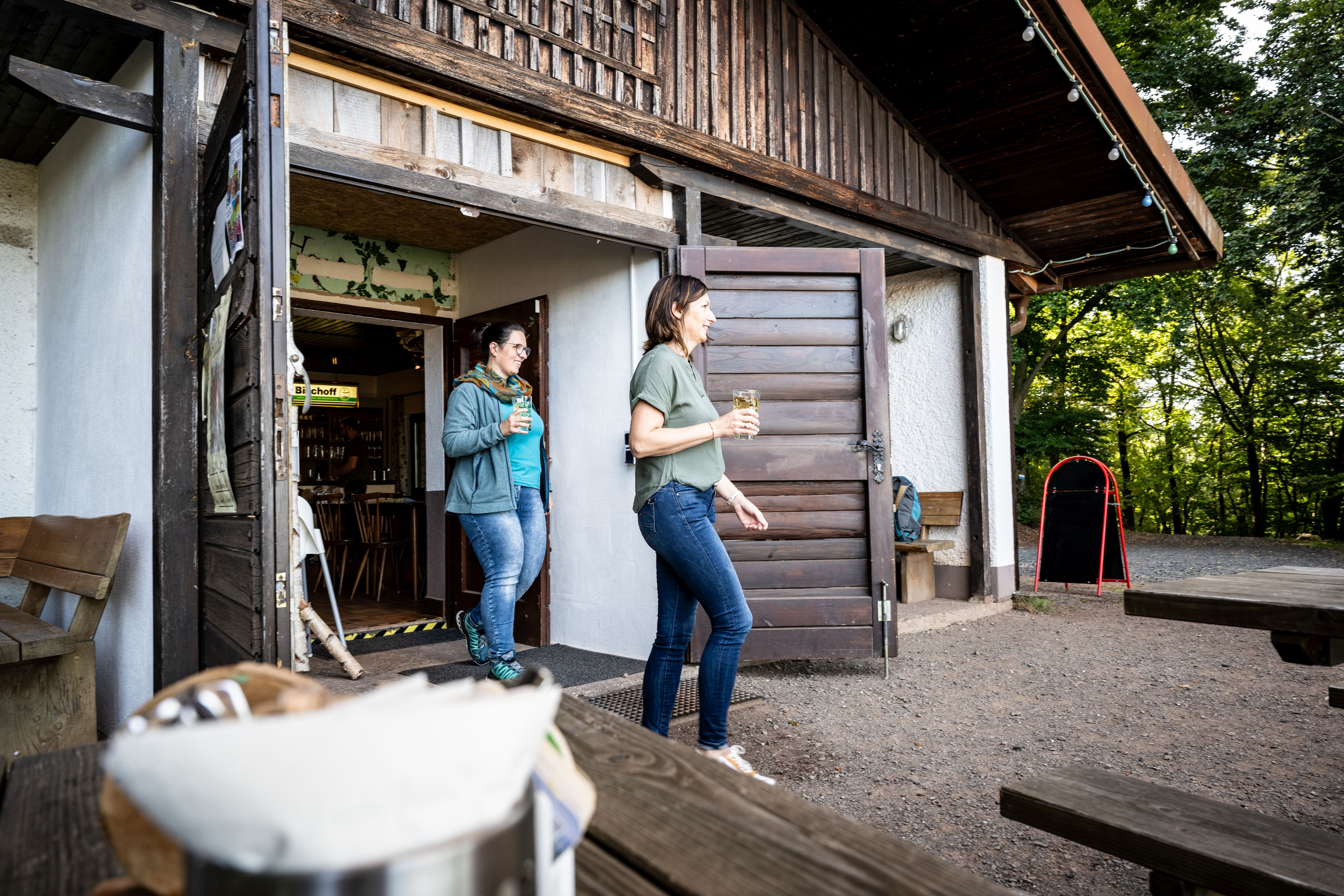 Die Türen werden aufgeschlossen. Holzläden öffnen sich. Frische Luft zieht durch den rustikal-gemütlichen Innenraum. Hier wird jedoch – später an diesem Sonntag – nur an der Theke großer Andrang herrschen. Dort wickeln nämlich hungrige und durstige Besucher ihre Bestellungen ab. Ihren Kaffee, sprudelnde Wein- und Saftschorle oder Weizenbier nehmen sie gleich mit. Denn im sonnigen Spätsommer sitzt man natürlich draußen auf den Bänken an den Tischen. Da großer Andrang zu erwarten ist, schlägt das Hüttenteam gleich zusätzlich Festzeltgarnituren auf. Eine Bank, ein Tisch nach dem anderen wird aus dem hinteren Abstellraum der Hütte nach draußen getragen.