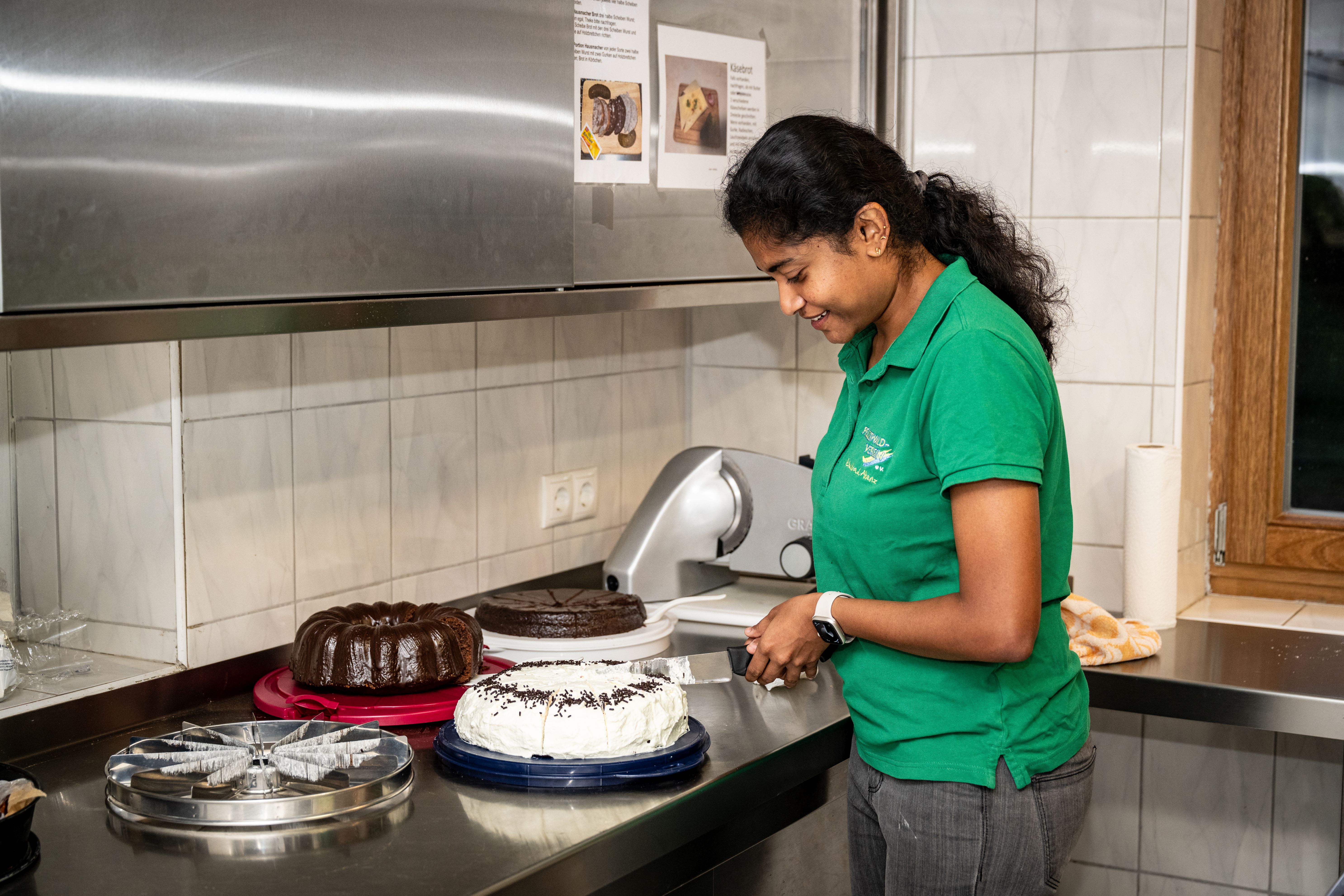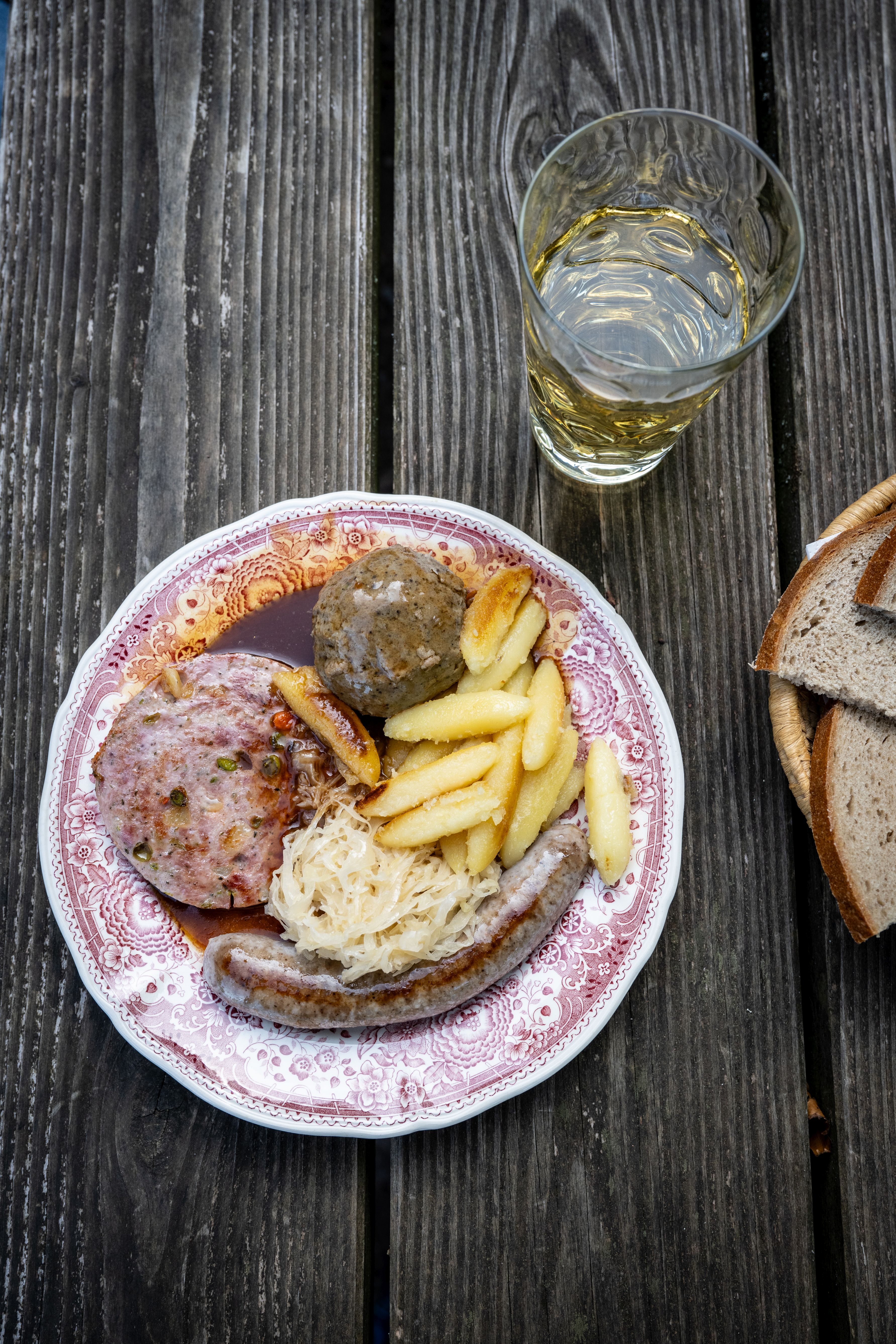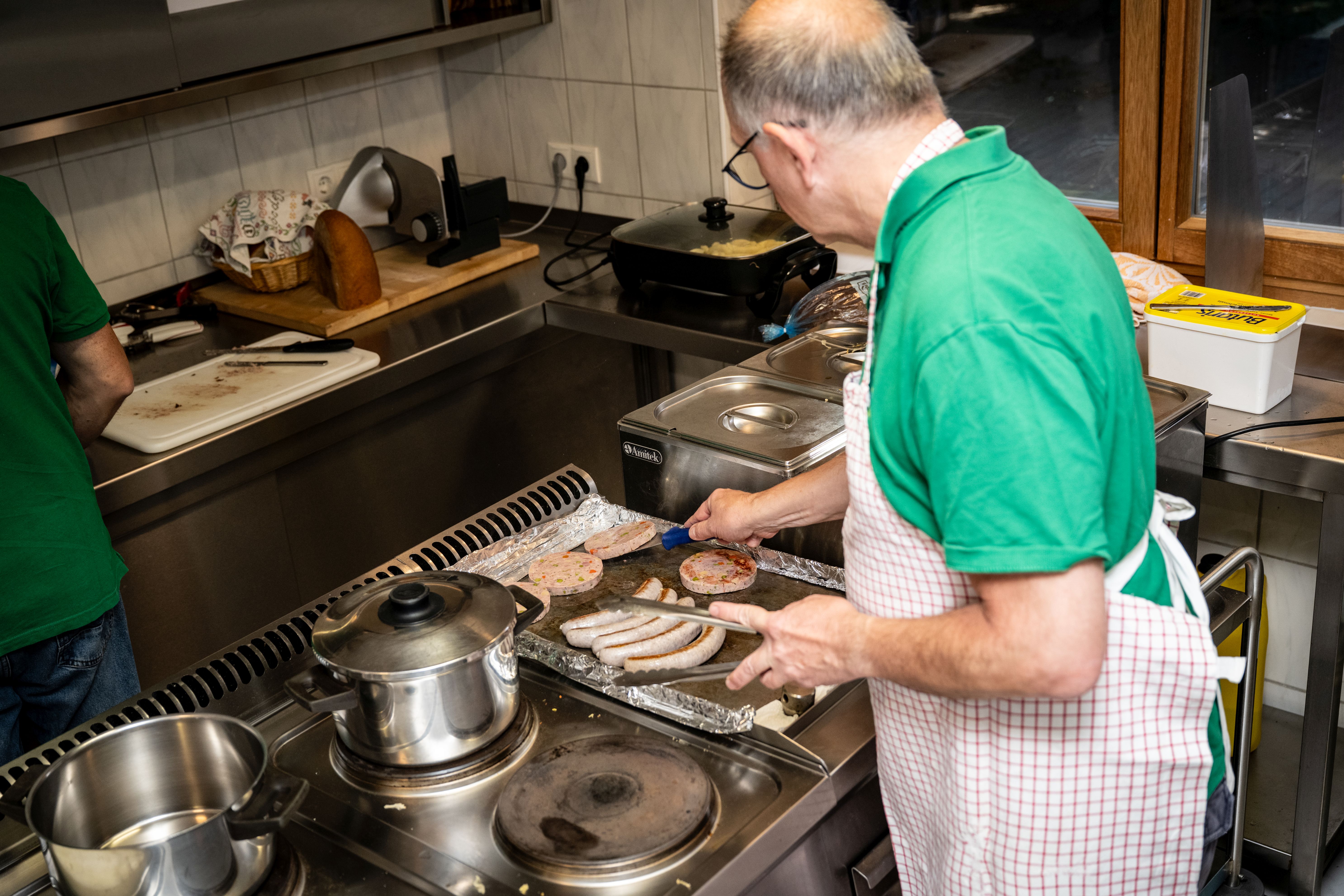In der Küche laufen parallel die Vorbereitungen an. Traditionell werden Leberknödel, Bratwurst, Saumagen mit Sauerkraut, Hausmacher Wurst oder – nicht nur für Vegetarier – Schupfnudeln sowie Weißer Käs mit Lauchzwiebeln und Radieschen serviert. Ganz besonders beliebt sind die zahlreichen hausgemachte Kuchen, die nicht nur zum Kaffee schmecken. Routiniert arbeiten alle Helferinnen und Helfer Hand in Hand. Und für die, die neu hinzukommen, hängen am Kühlschrank „Spickzettel“, die genau beschreiben, was wie auf die Teller kommt, damit am Ende alles passt.