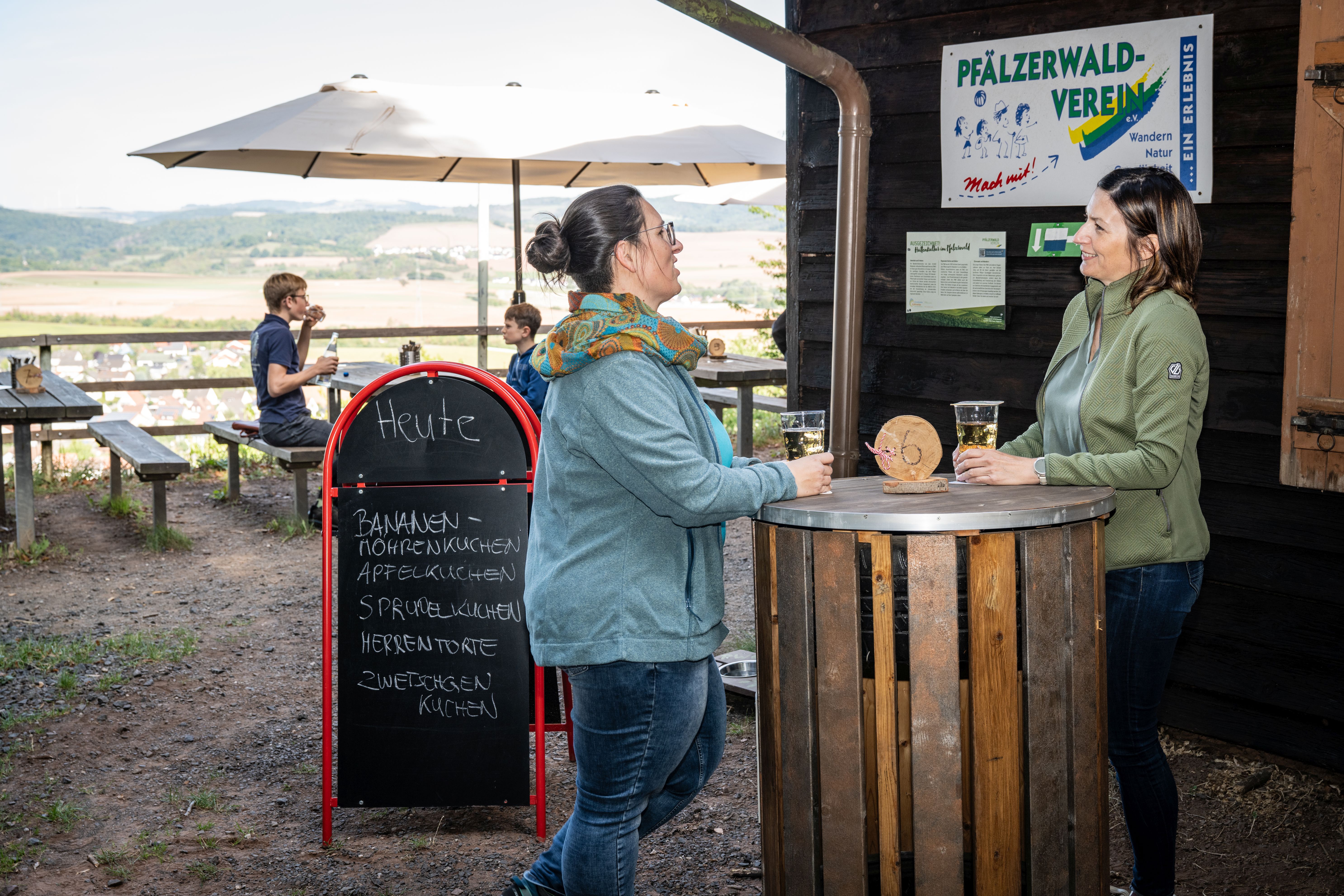 Zurück zur Hohlsteinhütte: Mittlerweile weht auch die PWV-Fahne im lauen Wind. Kenner wissen, dass es jetzt soweit ist. Denn das Motto der Pfälzerwäldler in Münchweiler lautet: „Wenn die Fahne hängt, wird ausgeschenkt!“ Es dauert nicht lange und kurz nach 10 Uhr treffen die ersten Gäste ein. Kaffee und auch schon bald die erste Weinschorle werden eingeschenkt. Getränke nimmt jeder selbst mit an seinen Tisch. Wer Essen wünscht, nennt die Tischnummer, die jeweils auf einem Holzschild am Tisch steht. Die frisch zubereiteten Speisen werden dann nach und nach vom Team serviert. Für den Andrang, der ab Mittag herrscht, hat Vorsitzender Schäfer eine einfache Erklärung: „Es ist einfach schön, hier einen Tag zu verbringen. Für gutes Essen und Trinken muss man bei uns kein Darlehen aufnehmen.“ Und den faszinierenden Ausblick gibt es gratis noch dazu.