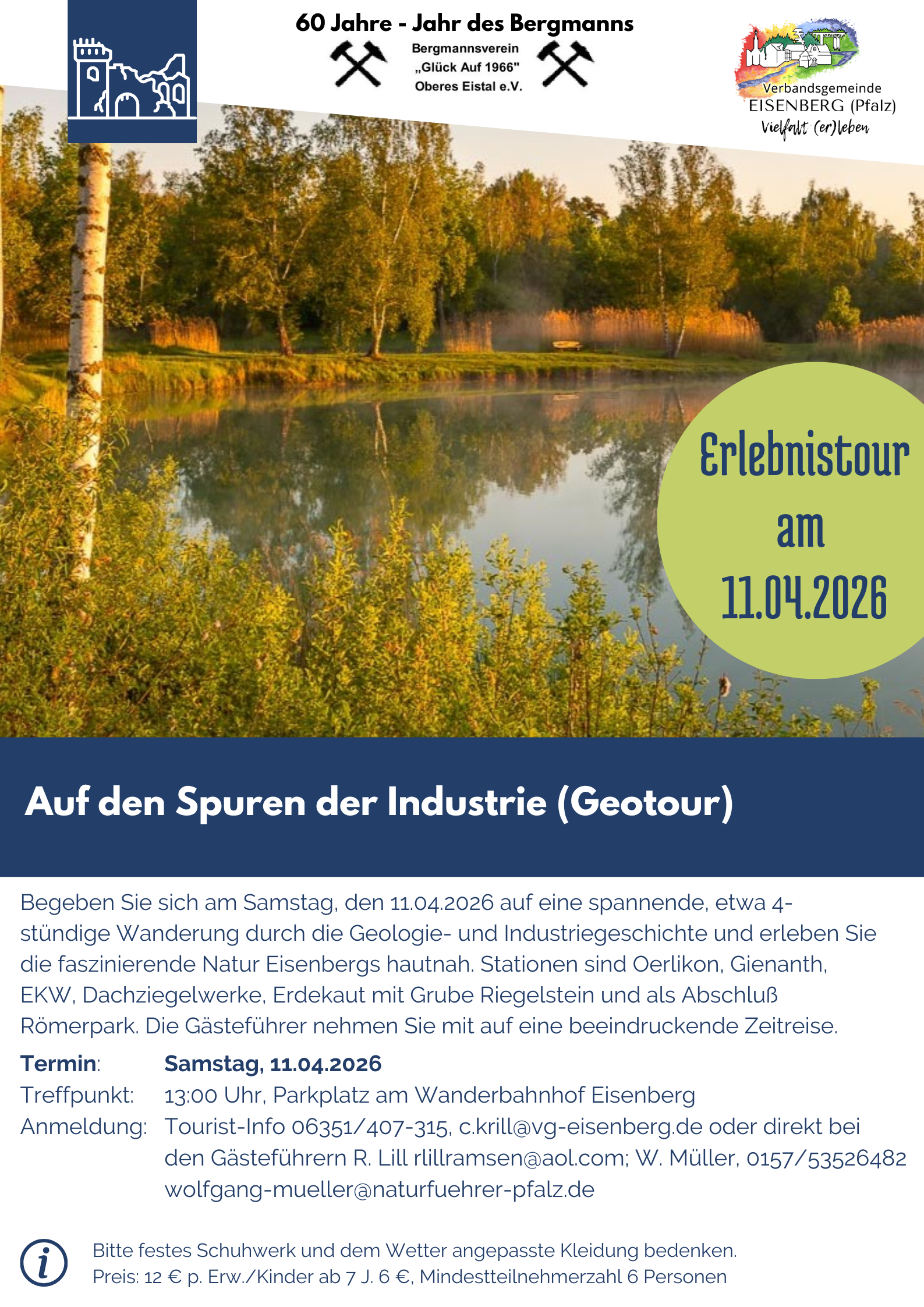 Anmeldung: Tourist-Info 06351/407-315, c.krill@vg-eisenberg.de oder direkt bei den Gästeführern R. Lill rlillramsen@aol.com; W. Müller, 0157/53526482 wolfgang-mueller@naturfuehrer-pfalz.de