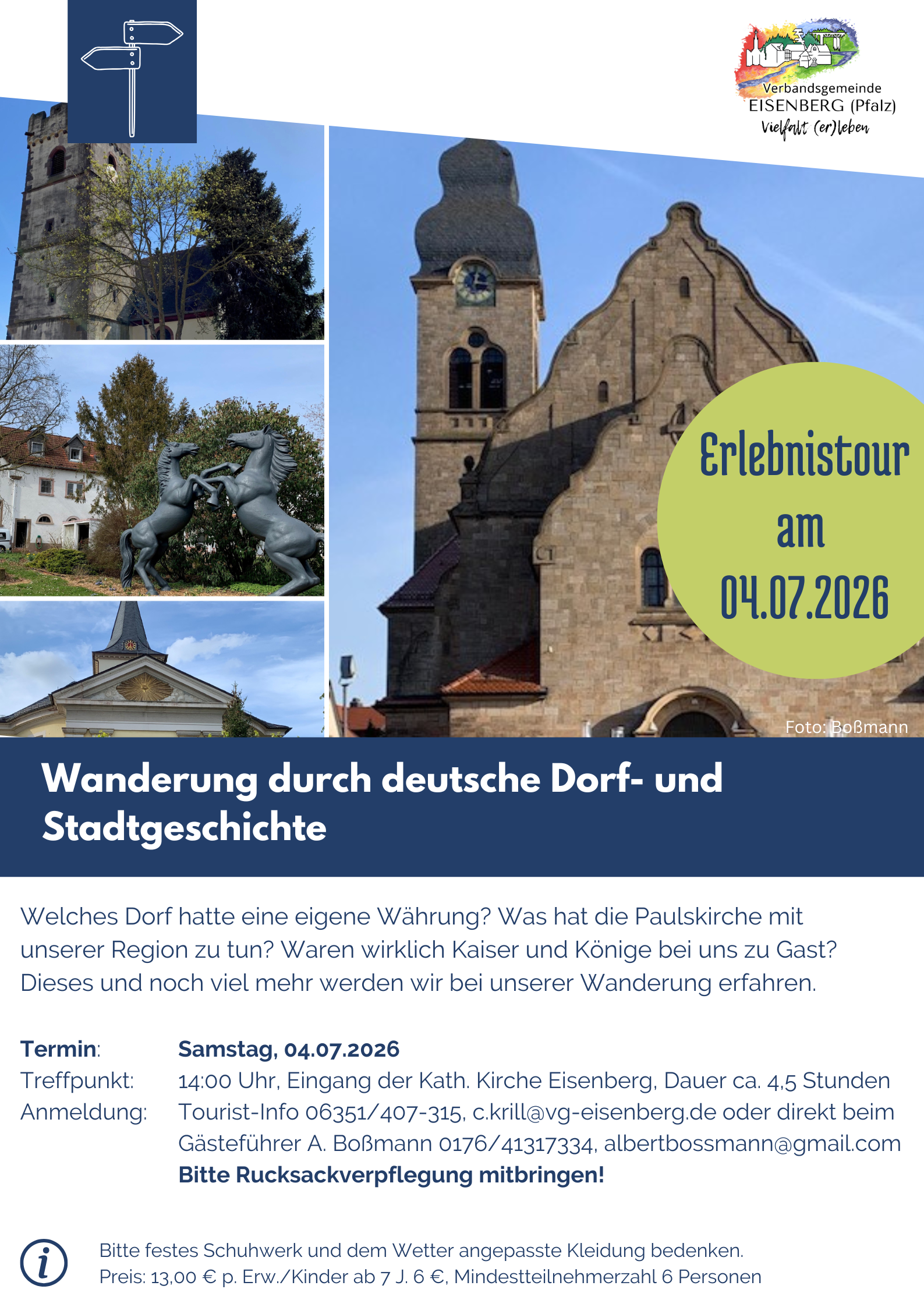 Anmeldung: Tourist-Info 06351/407-315, c.krill@vg-eisenberg.de oder direkt beim Gästeführer A. Boßmann 0176/41317334, albertbossmann@gmail.com