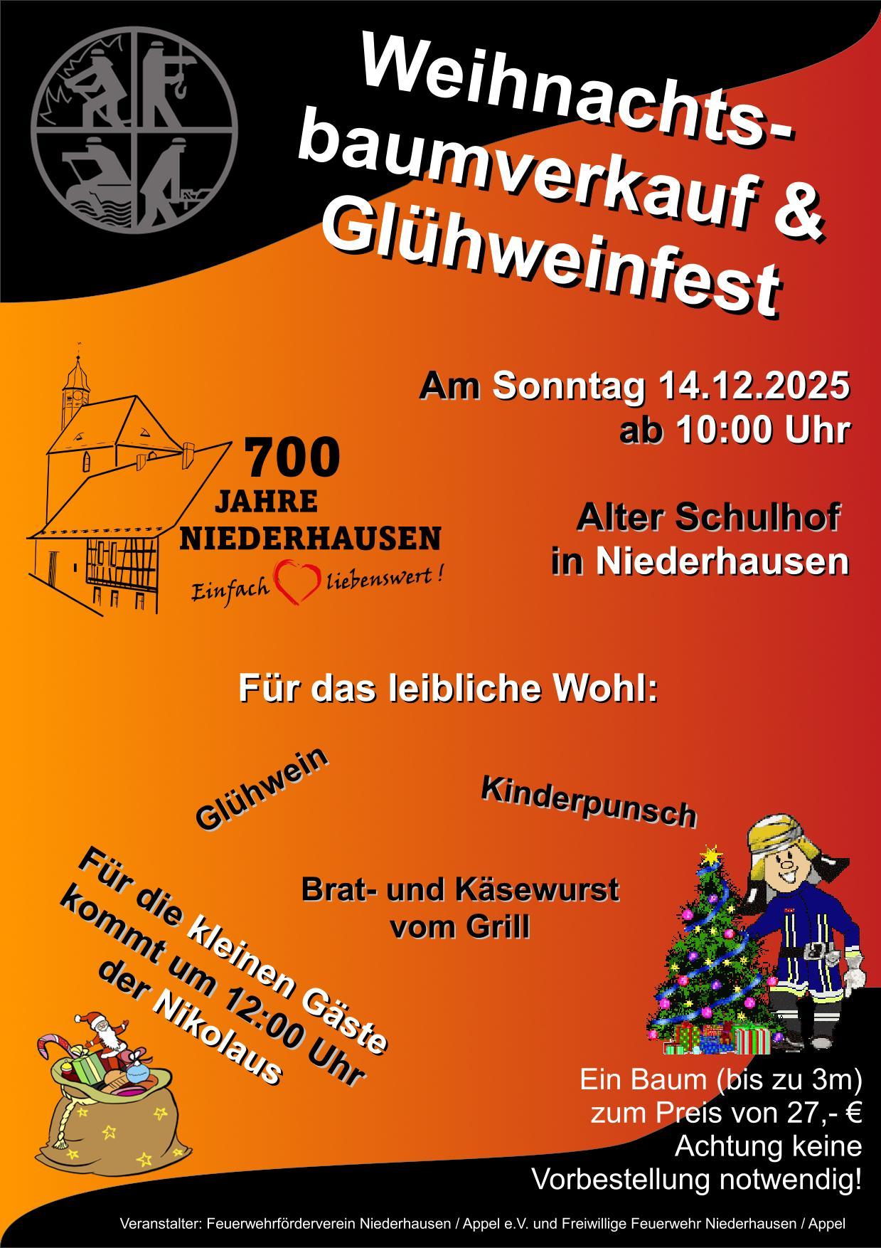 Glühweinfest des Feuerwehrfördervereins Niederhausen an der Appel mit Weihnachtsbaumverkauf. Für das leibliche Wohl ist mit Glühwein, Kinderpunsch sowie verschiedene Würste vom Grill gesorgt.