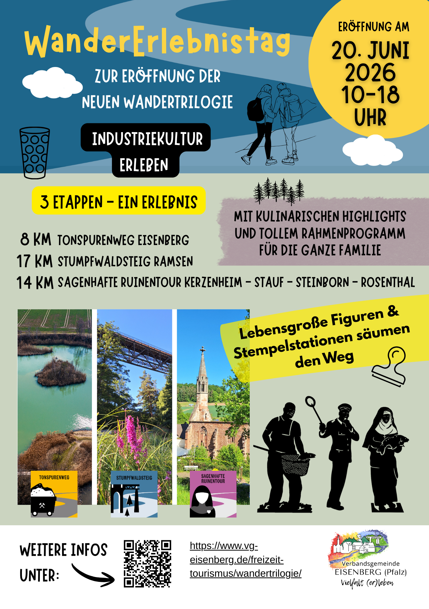 Eröffnung der Wandertrilogie "Industriekultur erleben" mit großem Wandererlebnistag und buntem Rahmenprogramm entlang der drei Etappen. Kulinarische Highlights, musikalische Unterhaltung sowie Stempelkarten entlang des Weges erwarten Wanderer, Familien und Pfalzliebhaber.